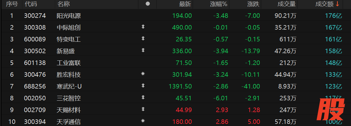 阳光电源成交额居首,为176亿元。其后是中际旭创、特变电工、新易盛、工业富联,成交额分别为167亿元、161亿元、158亿元、148亿元。